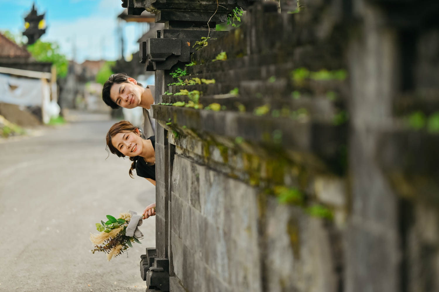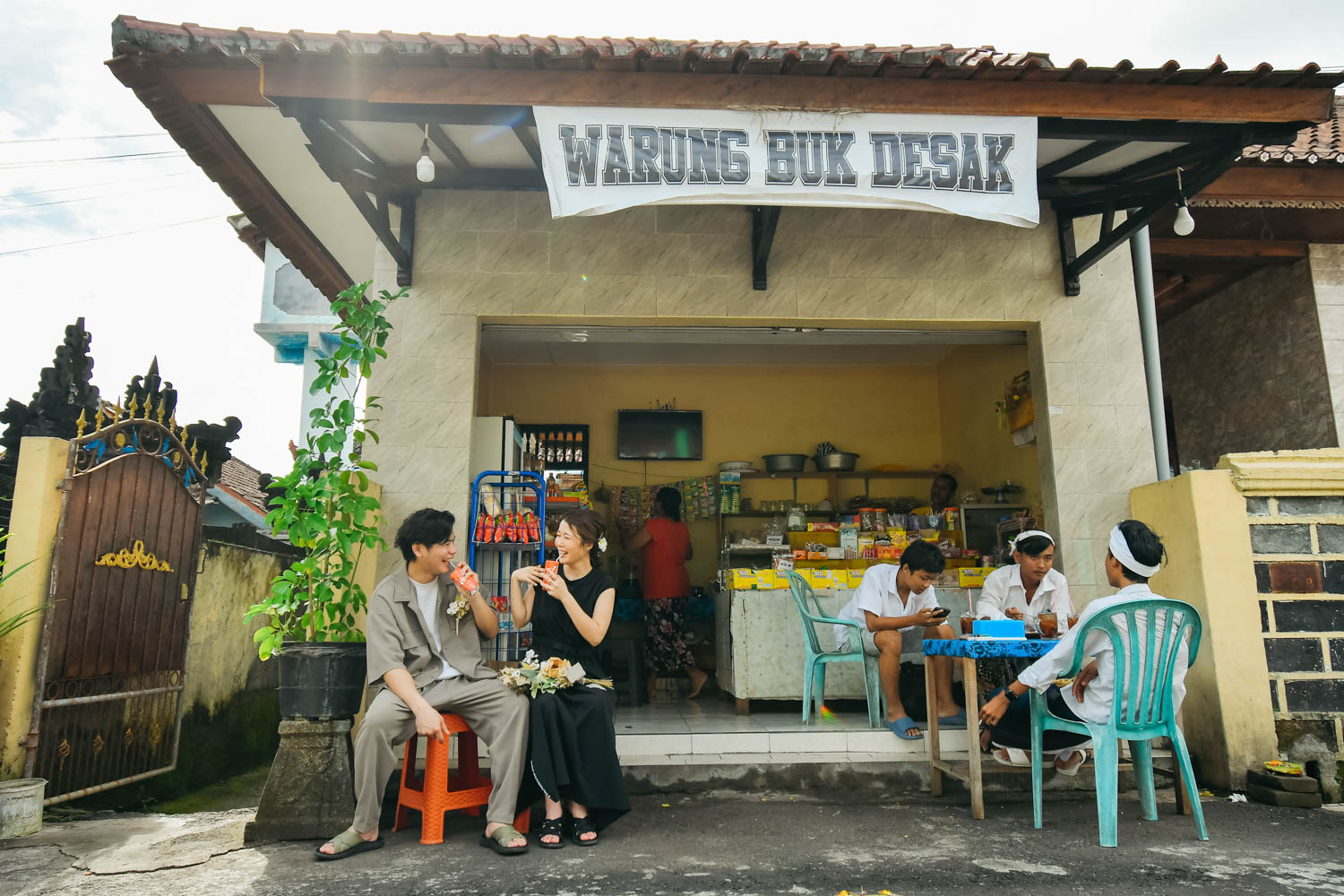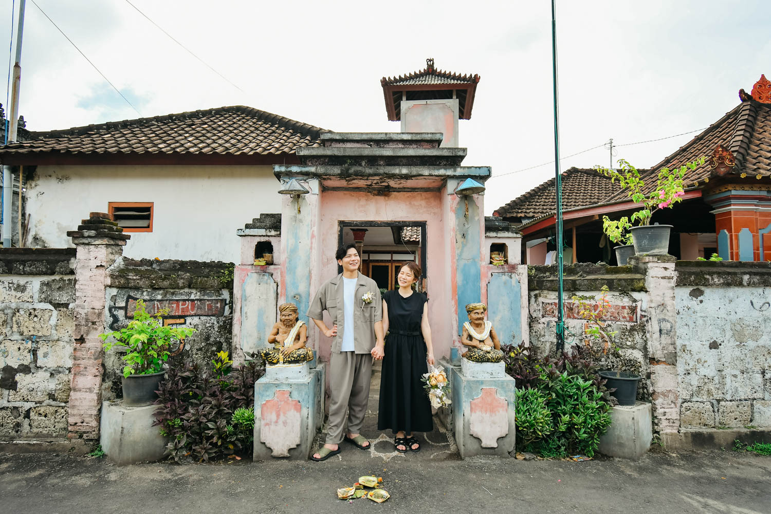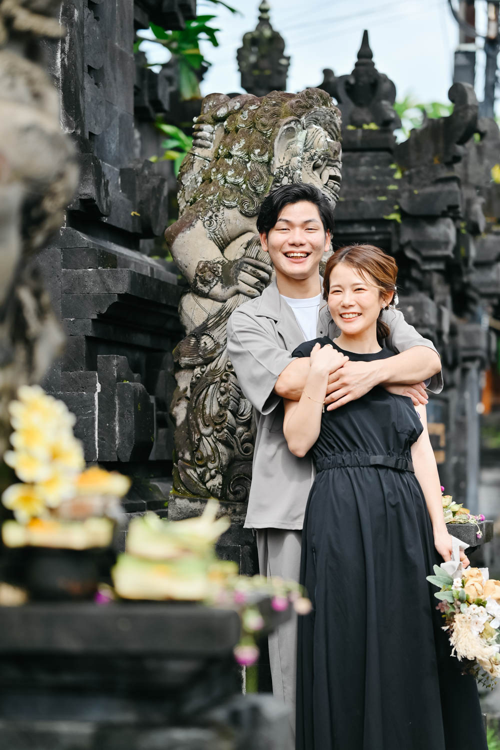 最初に街中で撮影しました。お二人はカジュアルなお洋服でしたので、イメージはバリ島でのデート!です。バリ寺院や小さな商店(ワルン)、カフェなど色んな場所で写真を撮りました。手に持っている造花ブーケはレンタルできます。