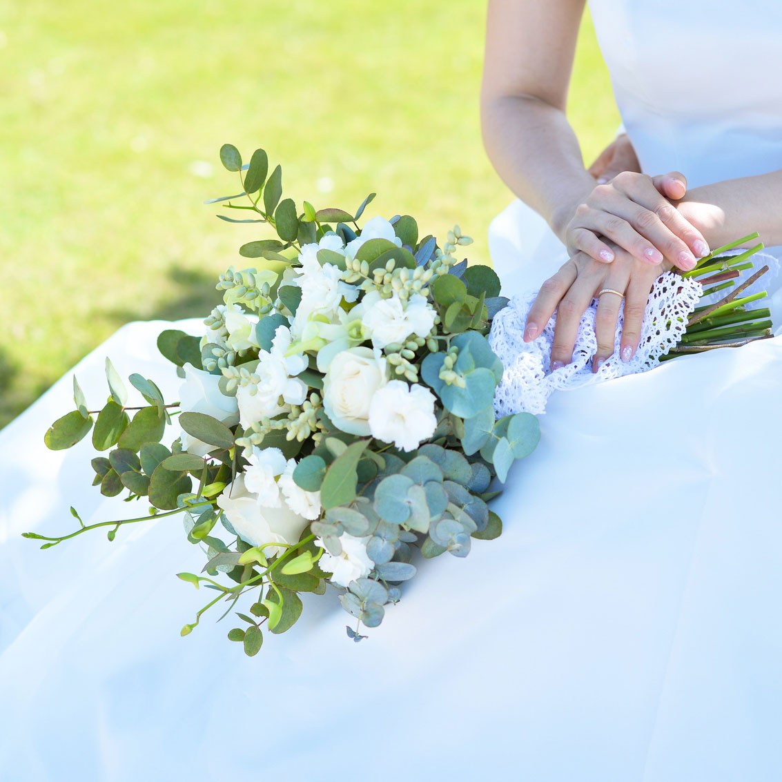 生花ならではの華やかさを写真に添えたい方へ。日本人フローリストが丁寧にお作りするブーケをご用意しています。ブーケ・ヘッドピース・ブートニアの3点セットになります。 お好みの花材を使ったオーダーメイドも承ります。