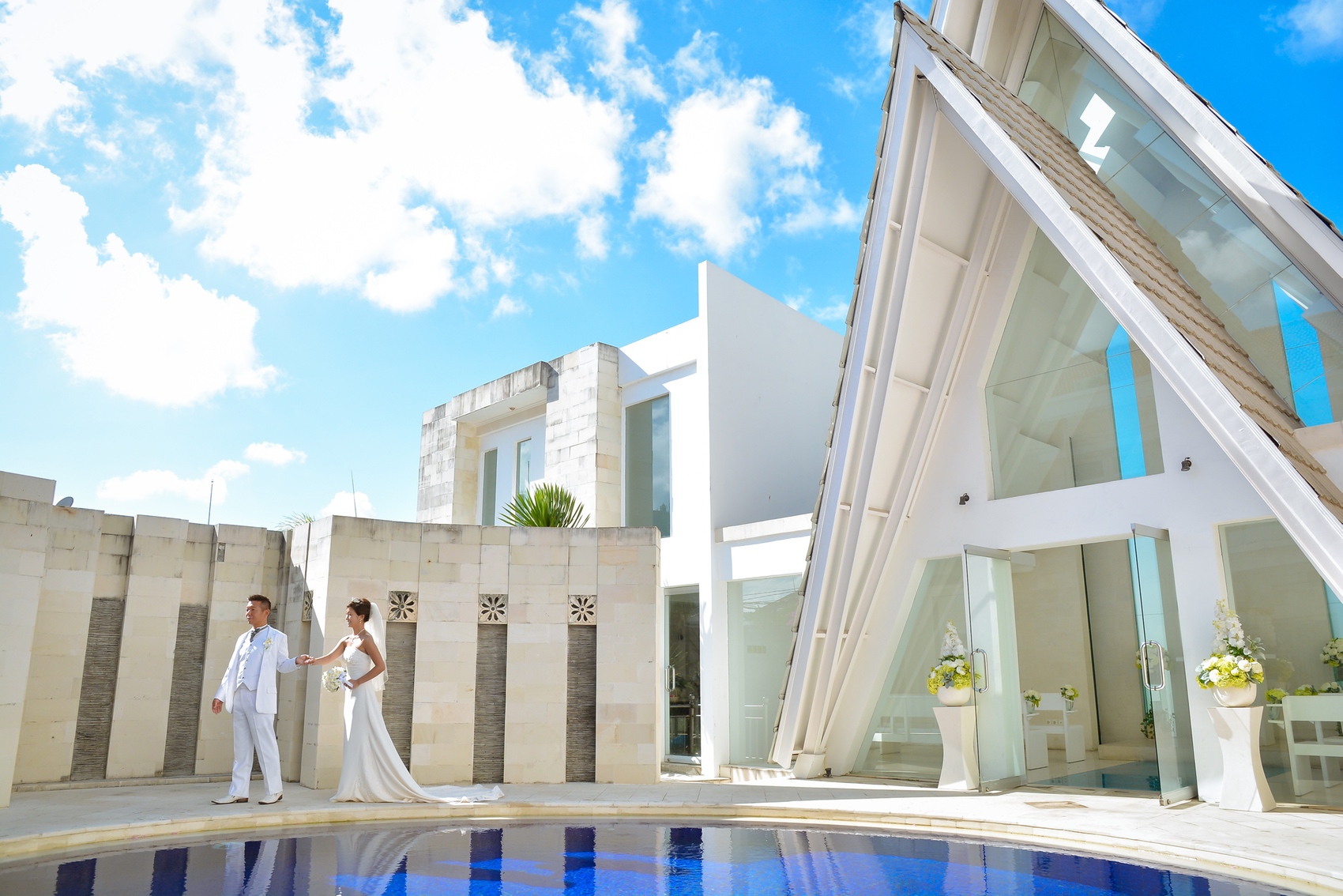 パッケージに含まれるプルメリアブーケを白バラのキャスケードブーケへと変更され、ヘッドピースも花冠にグレードアップ。