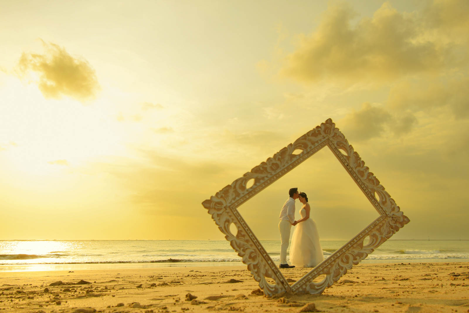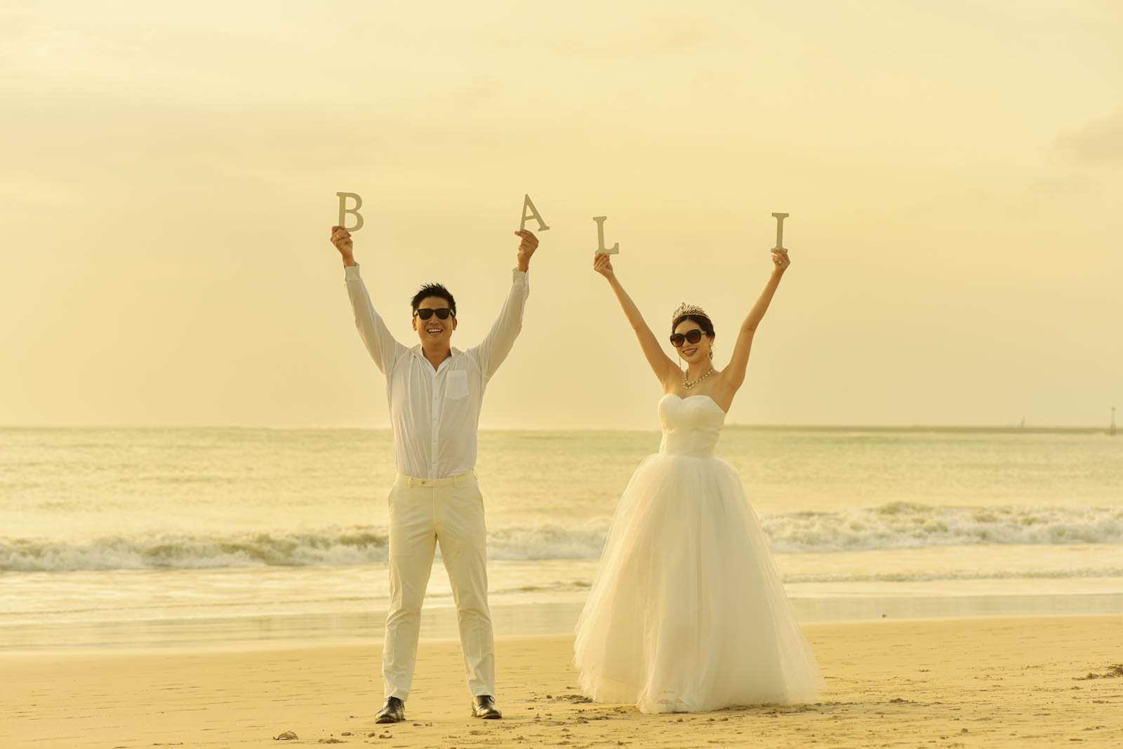 この日は天気がよかったです。ジンバランビーチでは綺麗に落ちる夕日が見れました。撮影中は小物も使いました。額縁や「BALI」のイニシャルブロックです。